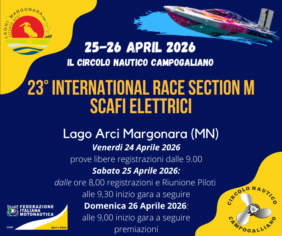 Dal 25 aprile 2026 al 26 aprile 2026 torna anche la Radiocomandata con la 23a edizione dell’International Race di Campogalliano, organizzata dal Circolo Nautico Campogalliano sul lago mantovano di Margonara, Strada dei Ronchi 99.